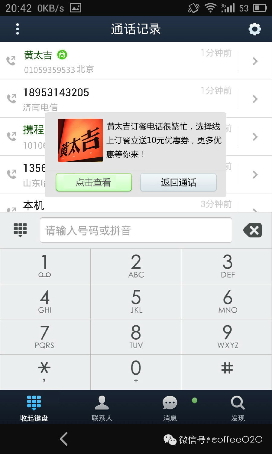 以最近人气火爆的黄太吉煎饼为 例,顾客在给黄太吉打了一个送餐电话后,即自动关注了黄太吉来店。随后,黄太吉主动推送最新商品服务信息,顾客在360通讯录中看到未读信息,点击进入后 即可查看到黄太吉其他店铺的相关信息,并可在线订餐及商家导航。值得关注的是,当中午订餐热线繁忙时,来店会提醒用户转为在线订餐,并实时推送在线订餐的 优惠信息,从而避免了因电话不通而造成的客户流失。