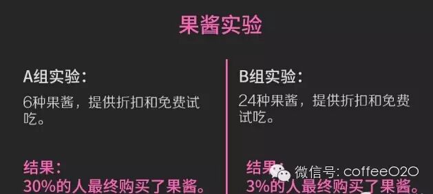 最后研究者发现,在提供6款果酱的组中,有30%的试吃消费者选择了购买;而在提供24款果酱的组中,只有3%的人最终选择了购买。