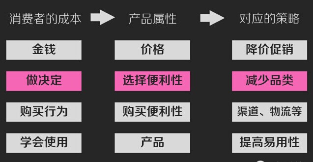 这些产品属性又对应的营销策略是:降价促销、减少品类、渠道策略(比如线下是多开店,线上是物流、支付体系等)、提高易用性。