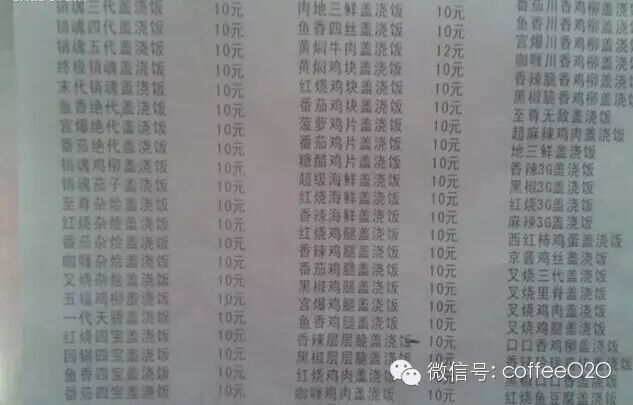 “饿了,来个盖浇饭吧!”老板说到,顺势递给我一张菜单,上面写着: