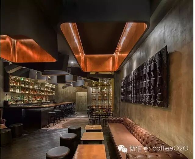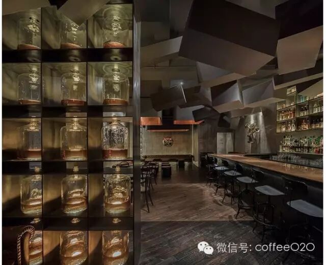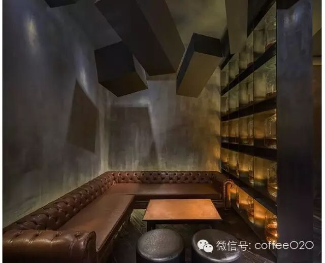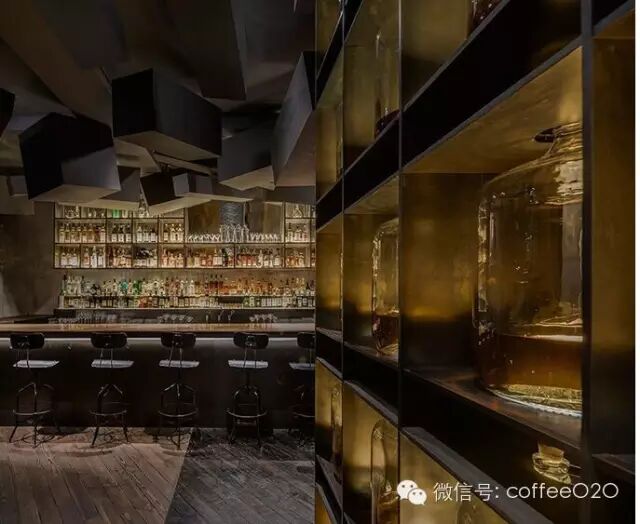 LED灯紧贴着酒吧柜台反光的背景,光投射到展示的酒瓶上,使观者产生关于深度的错觉,墙壁似乎消失了。倾斜的面板面对着入口,这样顾客往前看的时候将看到悬挂下来的立方体围绕在他/她的头顶,产生另一个微妙的视觉感受。在空间的远端,一个大凸面镜反射着整个酒吧。