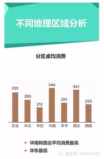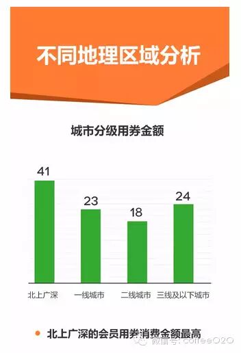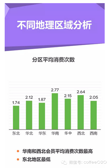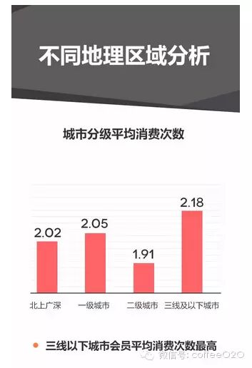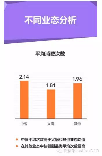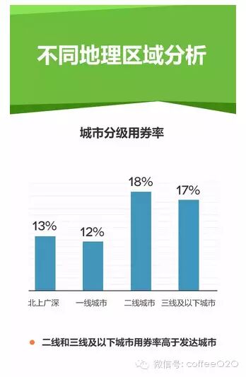 O2O君评论:华南市场因气侯原因及有早茶与夜宵小吃消费习惯在消费次数及AC上最高,西北市场由于消费者的地域风俗与个性原因第二高。而华东市场虽消费力高但受互联网程度高的影响,优惠额度高反倒AC最低。
