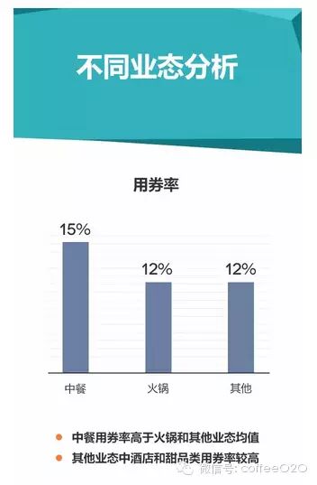 O2O君评论:中餐的消费频次、AC及用券率都高于其它业态,一是因为中餐店的数量居绝多,二是中国人还是飞惯消费中餐。