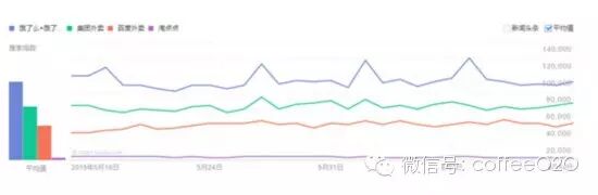 从近30天百度指数看,四家平台之间差距同样明显,饿了么相关关键词以96690的整体搜索指数领先,美团外卖、百度外卖和淘点点分别为64200、44362和4090。
