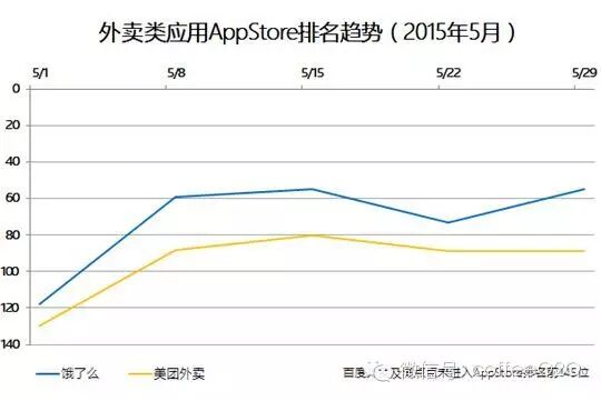 在AppStore 5月的排名上,饿了么与美团外卖5月平均排名分别为68和90,饿了么以较大优势领先美团外卖,百度外卖和淘点点则未进入AppStore免费应用排名前145位。