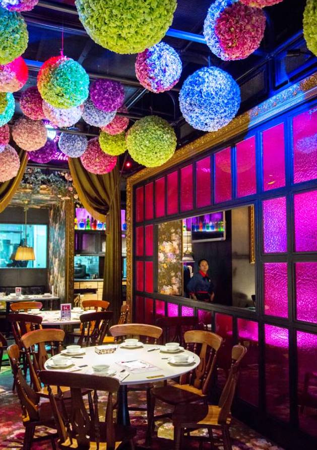 空间场景上,花团锦簇的门墙招牌是第一吸晴点。店内采用夸张的花浮雕、花摆设,天花、地板、橱柜上也铺满了不同的花饰,搭配紫的蓝的红的灯光,就像一座浪漫迷情的后花园。