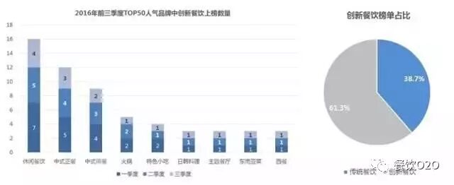 截止2016年3季度,人气餐饮品牌TOP50中,创新餐饮上榜比例近40%,其中以休闲餐饮最受好评,创新餐饮崛起至今已经快速占领市场,未来甚至会瓜分更多的市场份额成为主流。
