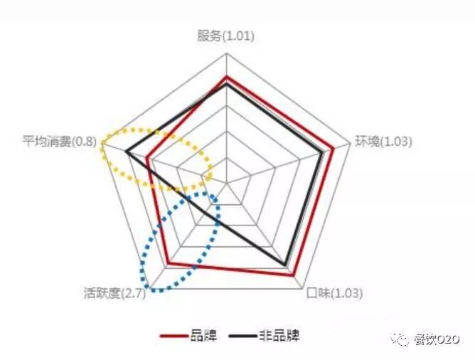 对比品牌与非品牌餐饮的各项指标,可以看到品牌连锁餐饮在服务(1.02倍)、环境(1.03倍)、口味(1.03倍)、活跃度(2.7倍)上均优于非品牌餐饮。