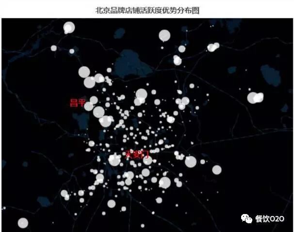 联系图形化分析可以更清楚地看到这一点。以各栅格品牌店铺的活跃度优势为圆圈直径,在地图上标出了北京、上海、深圳各市的品牌店铺优势分布情况。