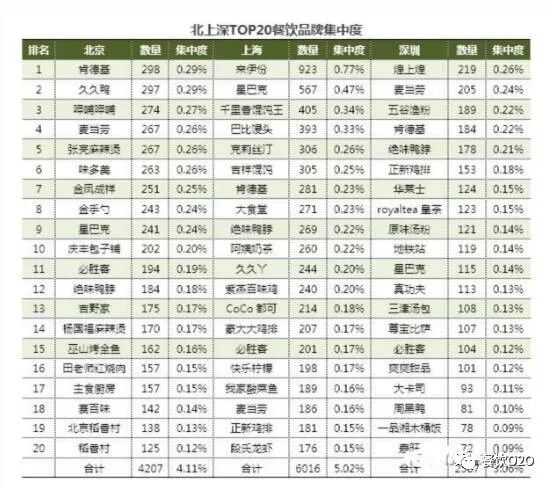 有趣的是,北上深排名前两位都是国内外带小吃+国外堂食连锁,北京:久久鸭+肯德基,上海:来伊份+星巴克,深圳:煌上煌+麦当劳。