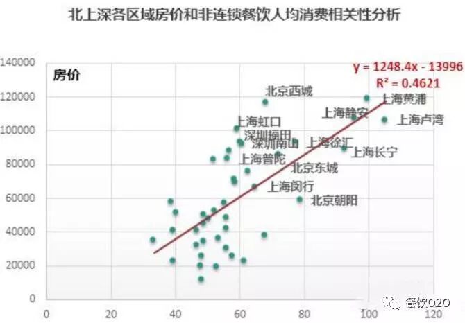 至于人均消费方面,还是非连锁餐饮和房价的相关性更高一些(0.68),拟合优度也达到了0.46,尚算不错的水平,而连锁餐饮由于要保证同城价格一致,且定位偏大众,所以人均消费与房价的相关性明不明显,只有0.24。