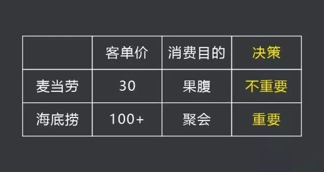 所以,“去不去麦当劳”,对用户来说是个不怎么重要的决策;而“去不去海底捞”,就要好好考虑一下了。