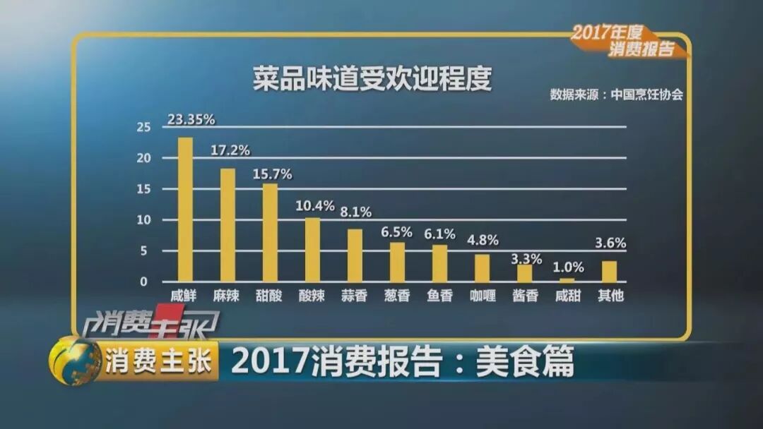 2017年,咸鲜口味超越了麻辣口味,排在菜品味道受欢迎程度的首位,达到了23.3%,麻辣占17.2%,甜酸占15.7%。酸辣占10.4%、蒜香占8.1%。