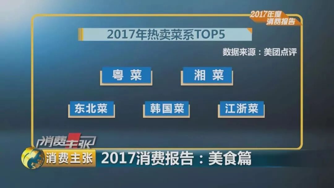 根据美团点评统计,2017年热卖菜系TOP5分别为:粤菜、湘菜、东北菜、韩国菜、江浙菜。