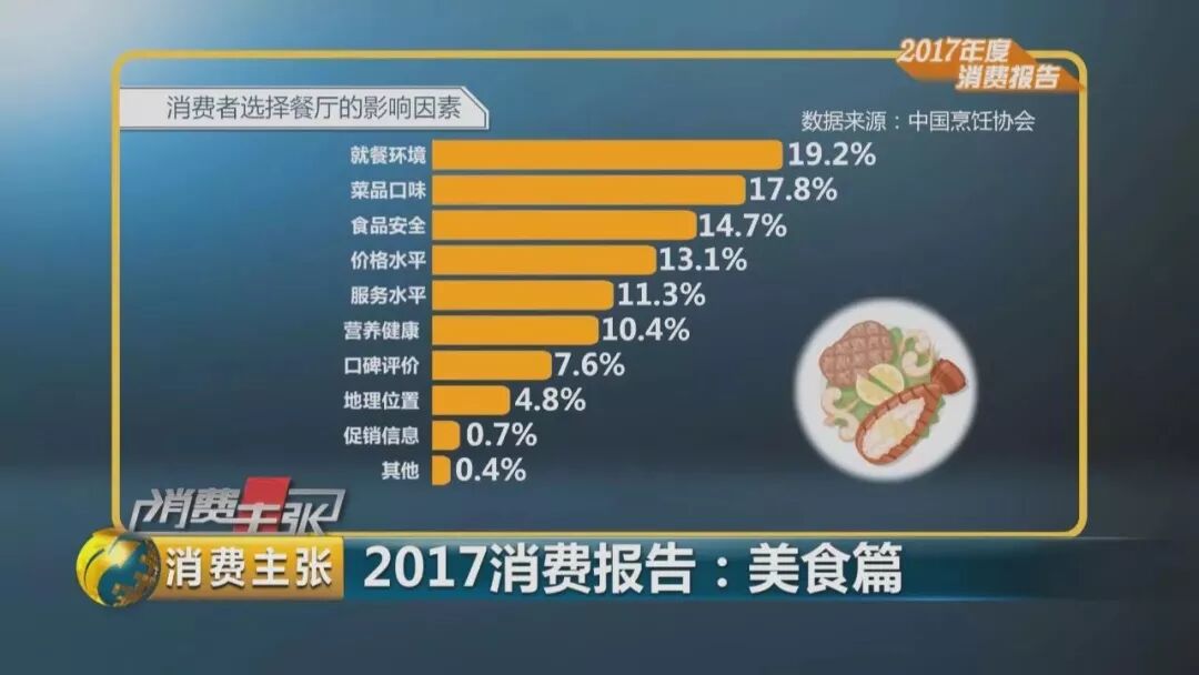 2017年,消费者在选择餐厅时,最关注的因素排在首位的是就餐环境,占19.2%,其次是菜品口味,占17.8%,不断追求优质的消费体验和消费环境。