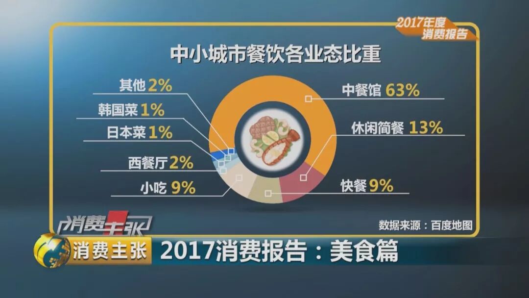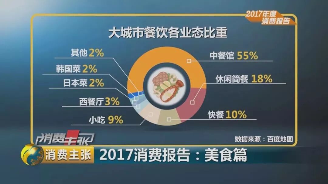 《2017年度美食消费报告》显示,中餐馆仍占据强势主导地位,市场份额最高,占到一半以上,占57%。