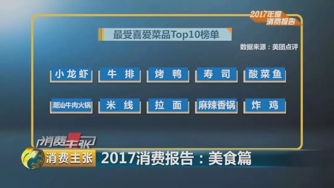 排在美团点评前十位的是:小龙虾、牛排、烤鸭、寿司、酸菜鱼、潮汕牛肉火锅、米线、拉面、麻辣香锅和炸鸡。