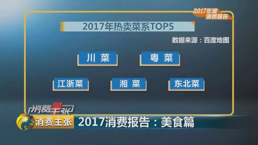 根据百度地图统计,2017年热卖菜系TOP5分别为:川菜、粤菜、江浙菜、湘菜、东北菜。