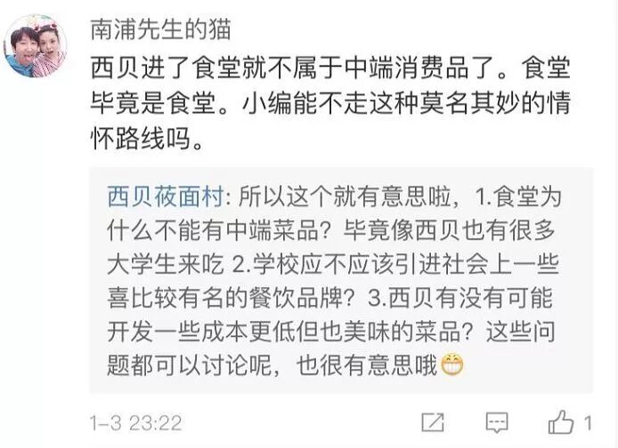 来看看西贝莜面村官方微博对这个问题的回答:食堂为什么不能有中端菜品?学校应不应该引进社会上一些比较有名的餐饮品牌?西贝有没有可能开发一些成本更低但也美味的菜品?