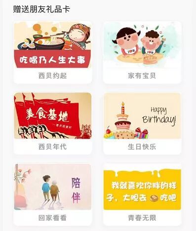 从线上看,除了完善 IT 系统,西贝推出了多种会员玩法。自持式的有,西贝喜悦会 VIP 会员、储值会员、注册会员等等。基于社交场景的礼品卡也没落下,购买理由都给你想好了,“家有宝贝”、“生日快乐”、“回家看看”等。