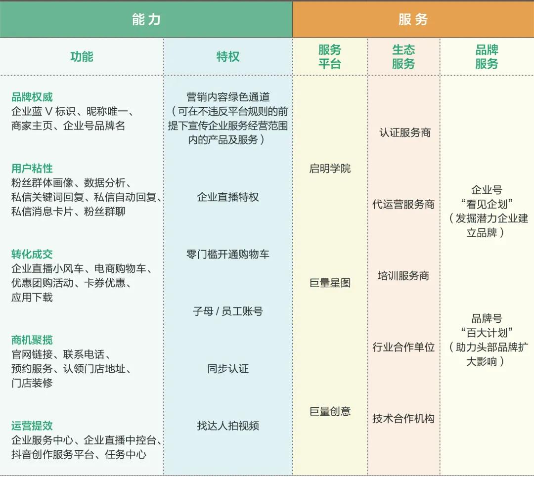 通过搭建完备的课程知识体系、讲师体系、服务商体系,持续为小微企业提供关于抖音企业号的知识服务、培训指导以及运营扶持,帮助企业更好地玩转企业号,打通营销路径,快速实现线上转型。