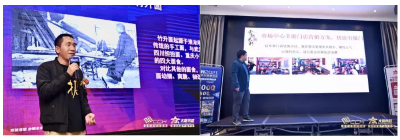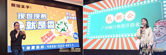 世界饭店联合会秘书长\CCH国际连锁展事业总监高蒙、道合餐饮集团创始人陈俊彬、常平竹昇云吞面创始人张斌、包道\煎饺王子品牌总监张志良、家门巷常德米粉创始人朱文杰、探潮集团包粥公项目总监胡如玲在大眼商机发布会现场路演。