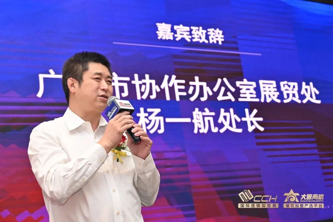 广州市协作办公室展贸处处长杨一航、广州市国内合作服务中心主任俞斌、原广东省政法委副书记叶敏辉、原海南省人力资源厅厅长林志向、原广东省食品药品管理局副局长吴圣明、世界饭店联合会主席姚黎明、世界饭店联合会执行主席/CCH国际连锁展创始人/大眼商机联合创始人郑军志等领导出席并发表致辞。