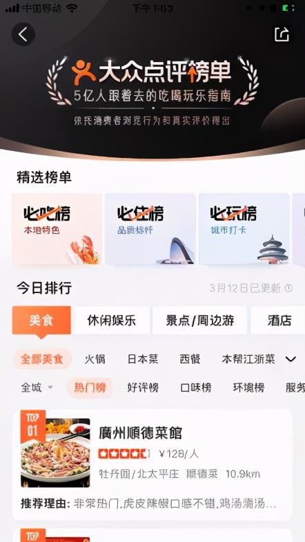其次,大众点评的必吃榜在点评内端有非常多的曝光位置,消费者从点评首页就能点击进行选择,无需过多操作。