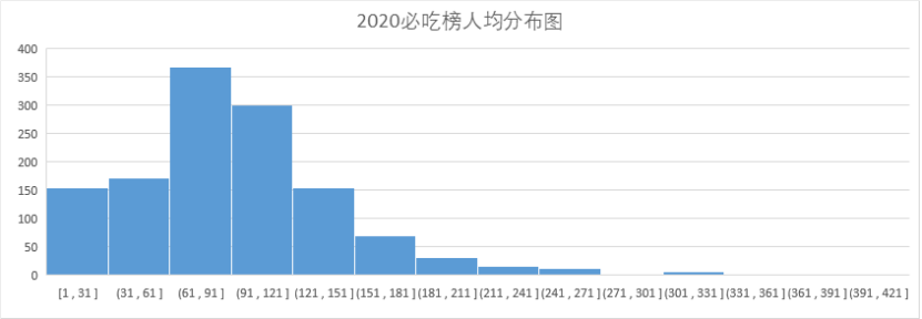 价格亲民是必吃榜的一个重要定位,在下图中,我们也可以看到 2020 必吃榜上榜餐厅价格区间的整体情况。这个是全国榜单的整体情况,每个城市也会有所不同。