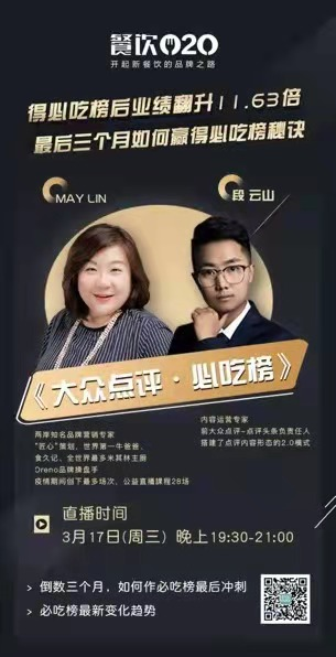 3月17日,餐饮O2O邀请两岸知名专家May、前大众点评头条负责人段云山直播分享《得必吃榜后流量翻升11.63倍,最后三个月如何贏得必吃榜密诀》,扫码报名,前100名免费!