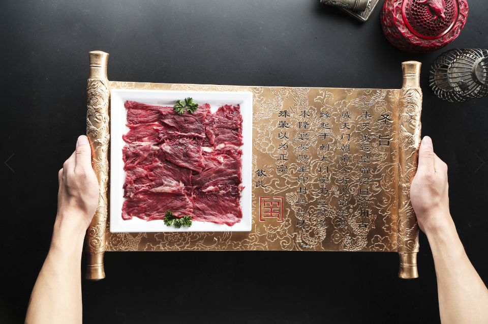 以朝天门火锅为例,推出的经典菜品“手切小黄牛”,在上菜时便有着强大气场,用圣旨端着上菜,豪爽霸气中更缠绕着牛肉的麻辣嫩气和嚼劲。