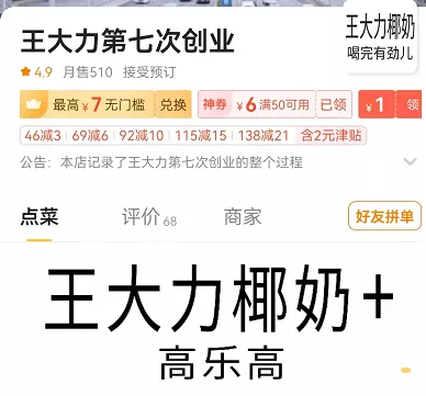 王大力第七次创业,是这家店的全名。要不是旁边“王大力椰奶”,真不知道和饮品能沾什么边。