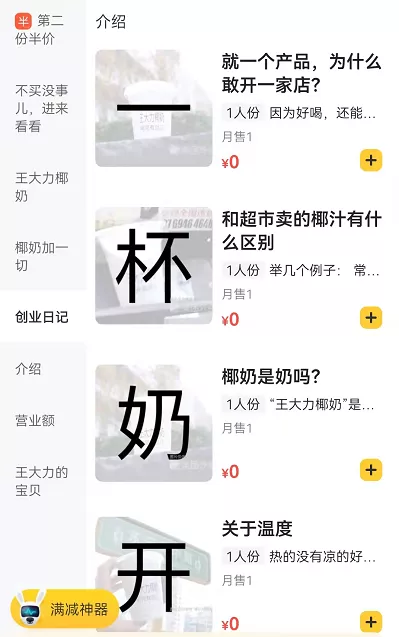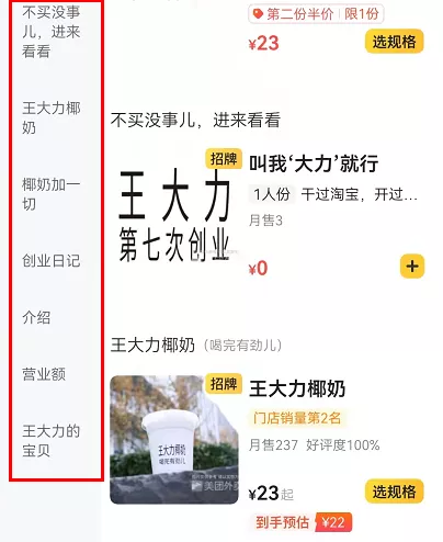 菜单分类不是水果茶、不是奶盖茶,你常见的都没有。而是被“”不买没事儿,进来看看”、“营业额”、“王大力的宝贝”这些不着边际的语句、词汇占据着。