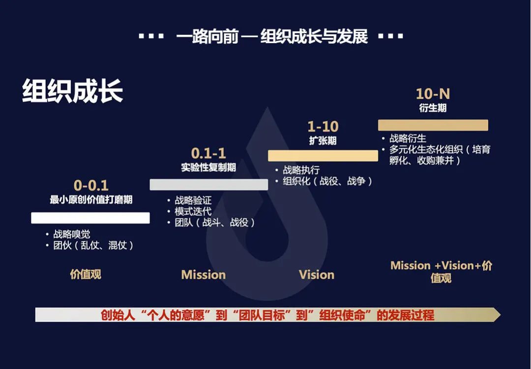 越过1以后,证明商业上我们的产品成立之后,我们才需要做正式的组织建设,一旦做组织建设,这件事就没有回头路。