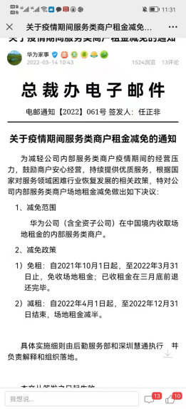 3月14日,华为总裁任正非签发,减免内部服务类商户租金,其中,免租6个月+减租9个月,合计减免租金15个月。