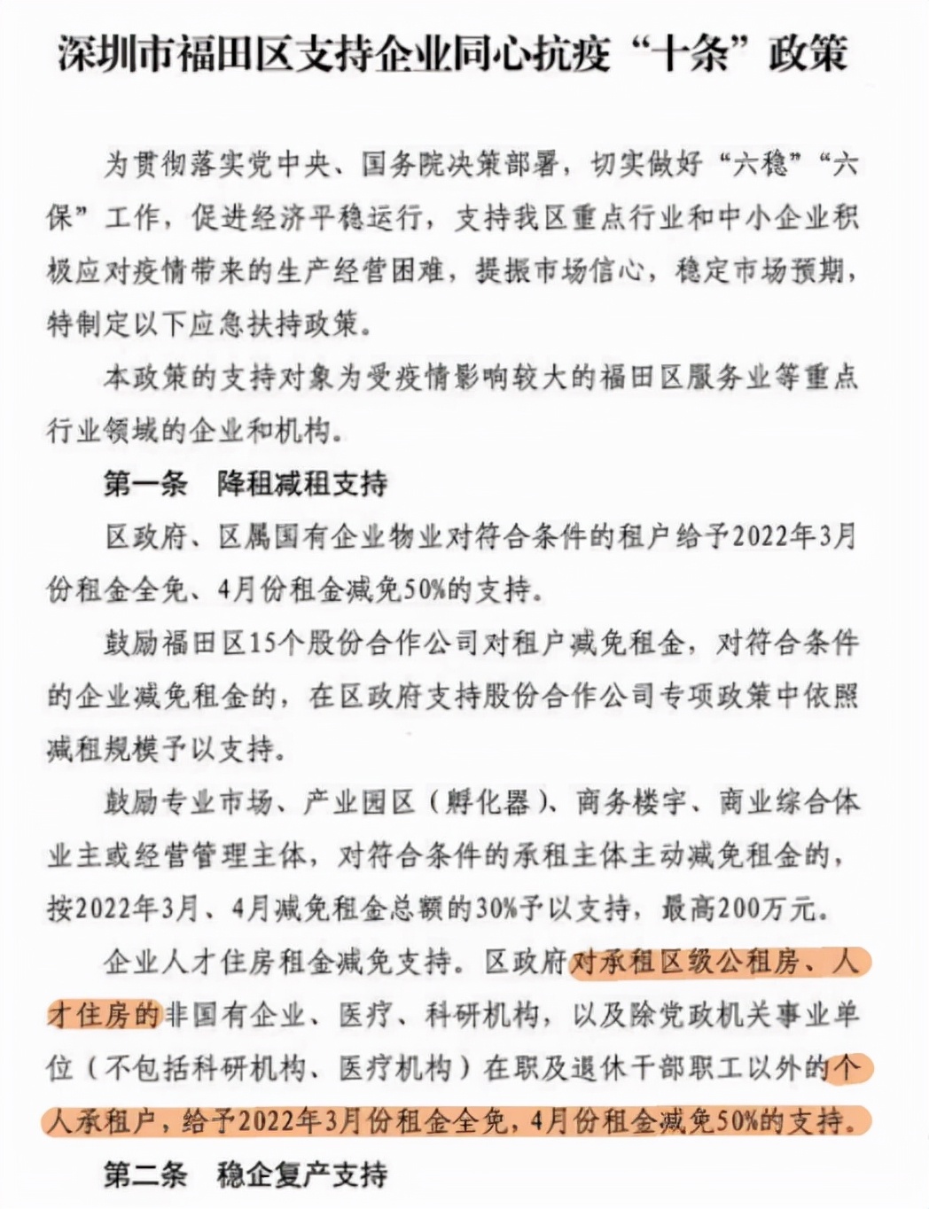 3月10日,深圳市福田区政府发布《深圳市福田区支持企业同心抗疫“十条”政策》,号召国企物业对符合条件的租户给予3月份租金全免,4月份租金减半等支持。