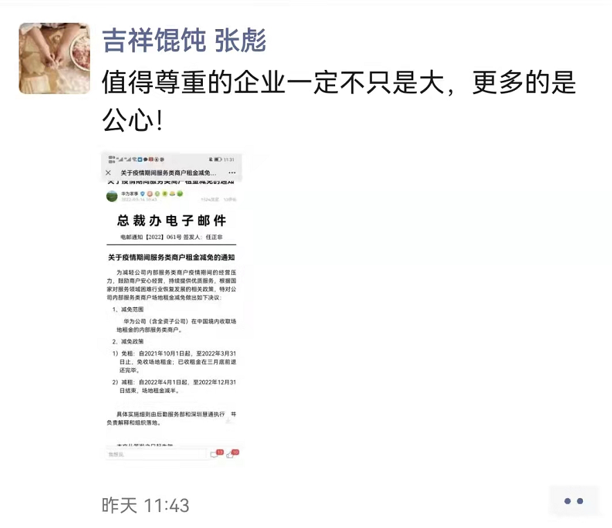 “我在华为园区有2家门店,这次长达15个月的减租、免租给了我们很大的安慰,在这个时刻能够有企业愿意站出来,一起承担压力,多多少少都给我们带来一些信心……”。