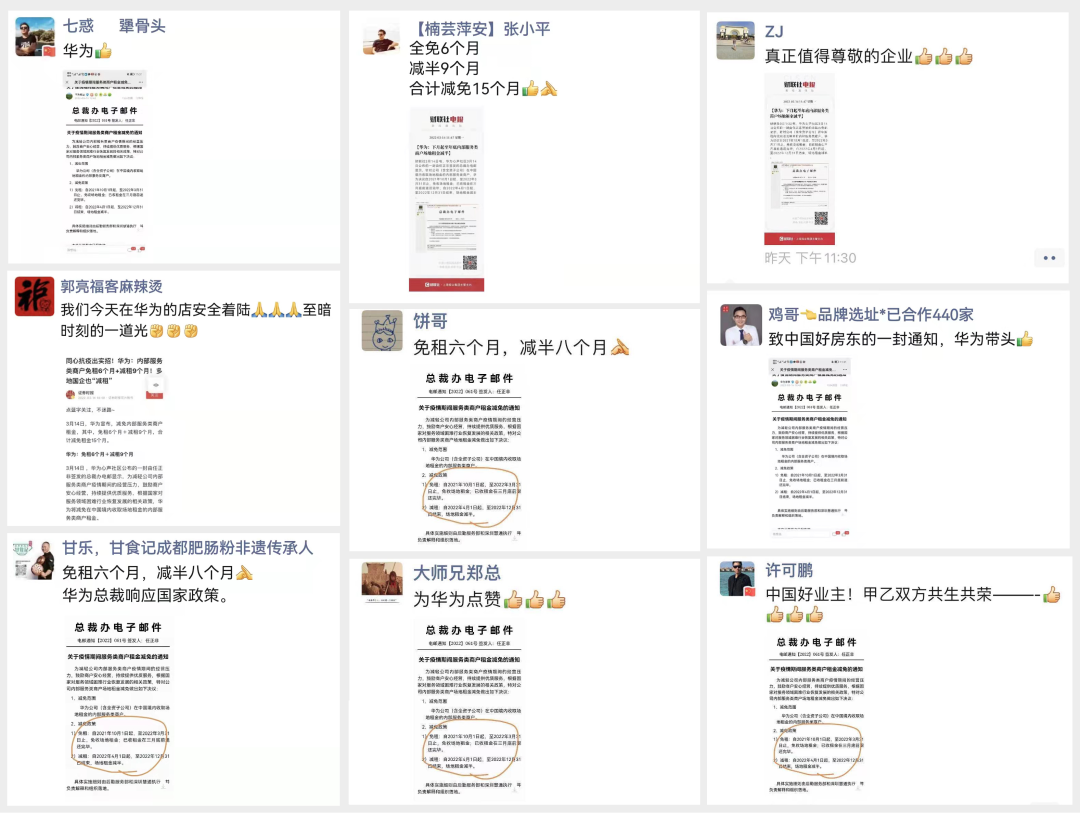 免租、减租一年半已经算绝无仅有,华为还要求中国境内所有华为物业,已收租金的,将全部于3月31日前退回,可退回6个月租金。