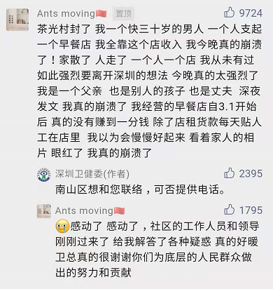 市民赖先生在上面写道:“茶光村封了,我一个快三十岁的男人,一个人支起一个早餐店,我全靠这个店收入,我今晚真的崩溃了!家散了,人走了,一个人一个店,我从未有过如此强烈离开深圳的想法……我经营的早餐店自3.1开始后,真的没有赚到一分钱……”