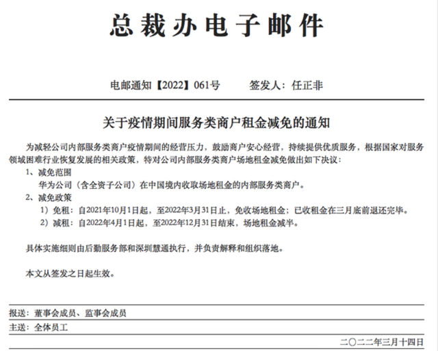 3月14日,华为总裁任正非签发,减免内部服务类商户租金。其中,免租6个月+减租9个月,合计减免租金15个月。对租赁华为园区内部物业的商户(主要是外包餐厅、超市、酒店等),免除2021年10月1日至2022年3月31日的租金,已收租金月底前退还完毕;对2022年4月1日至2022年12月31日期间的租金减半收取。