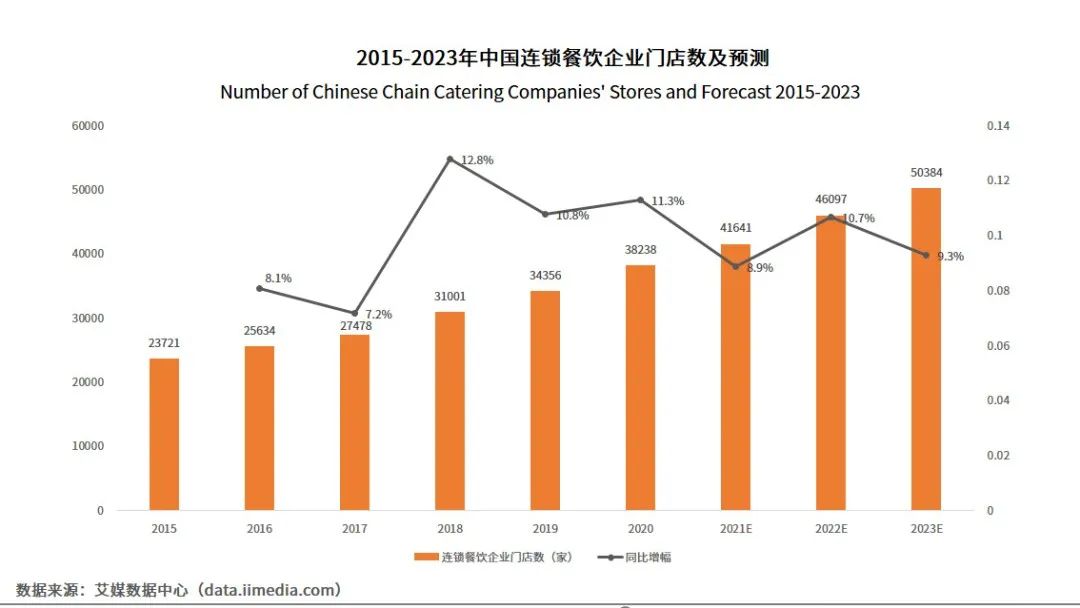 预制菜一个典型的市场表现,就是连锁门店。艾媒咨询的报告显示,2021年中国连锁餐饮门店达到41641家,近年持续高速增长。
