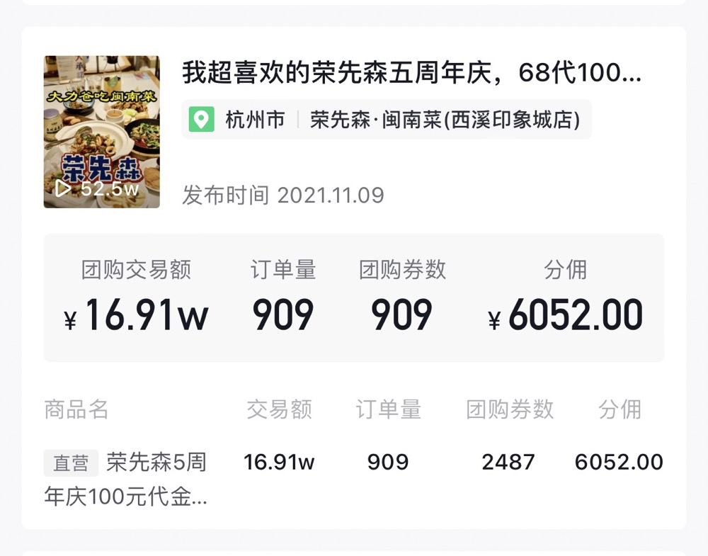 之前一条「荣先森」代金券活动的视频,直接卖出了将近 17W 的销售额,佣金赚了约 1W 元。