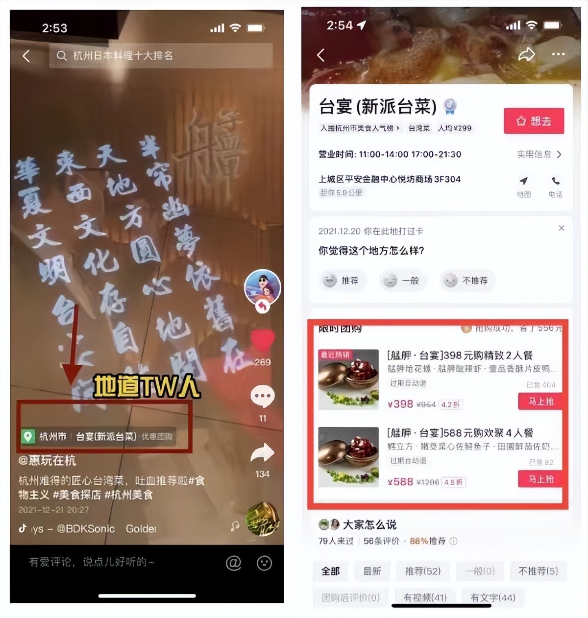抖音探店团购达人在探店后会制作和发布视频,在抖音上刷到这类探店视频的用户如果感兴趣,可以点击视频左下角的「定位」直接去购买套餐。