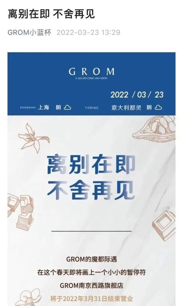 https://p3.toutiaoimg.com/img/tos-cn-i-qvj2lq49k0/7c5de5d4f8944dd49f07d8c076b5cae7~tplv-tt-shrink:640:0.image3月25日,一则闭店的消息悄悄出现在餐饮人的朋友圈。GROM南京西路旗舰店发出一则公告:店铺将于2022年3月31日结束营业。该店也是大陆首家GROM门店。