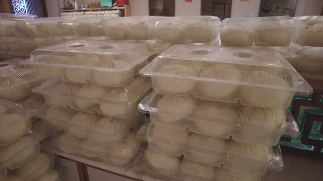 而在另一家老字号春风松月楼,工作人员正在将蒸好的素菜进行分装打包,等待配送的包子已经放满整个店。