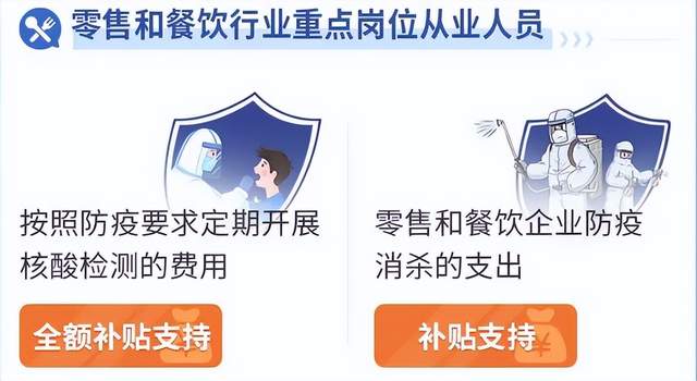 措施还指出,对零售和餐饮行业重点岗位从业人员,按照防疫要求定期开展核酸检测的费用,给予全额补贴支持;对零售和餐饮企业防疫消杀支出给予补贴支持。