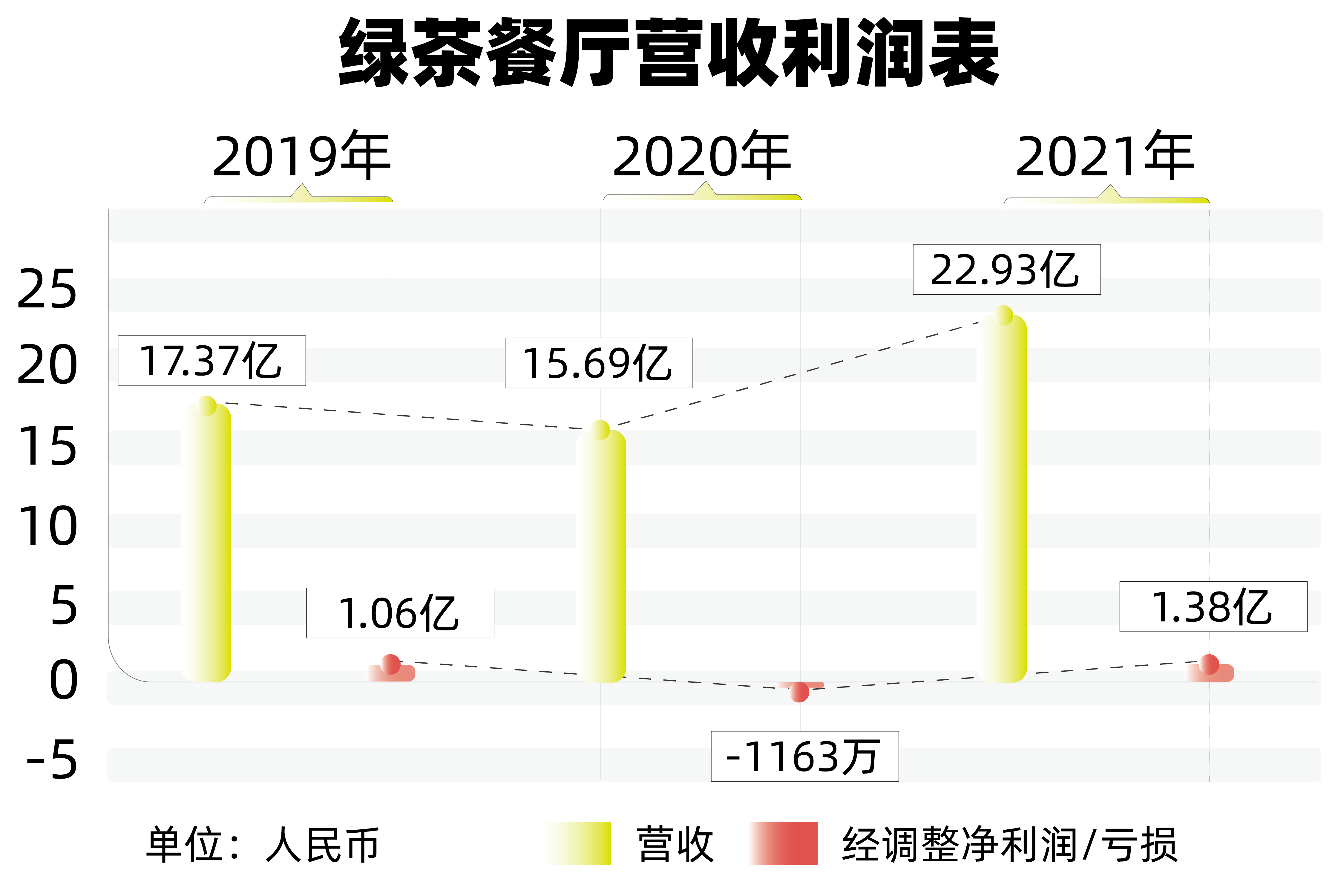 根据最新发布的招股书显示,2019至2021年三年间,绿茶餐厅的营业收入分别为17.37亿元、15.69亿元、22.93亿元。由于疫情影响,集团2020年的经调整净亏损为1163万元,而2019年和2021年的经调整净利润则分别为1.06亿元及1.38亿元。