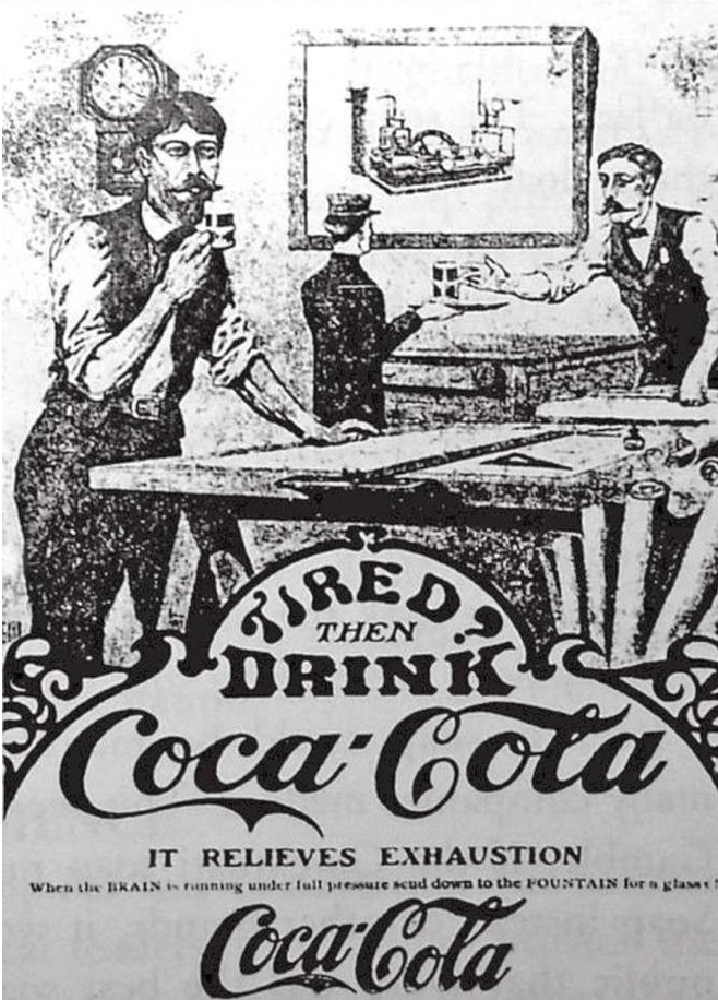 1892年,面世仅5年的可口可乐刊登的广告是这样一种画风:理想的大脑滋补品,冬夏皆宜又令人爱不释手的饮料!治疗头痛,解除疲劳。