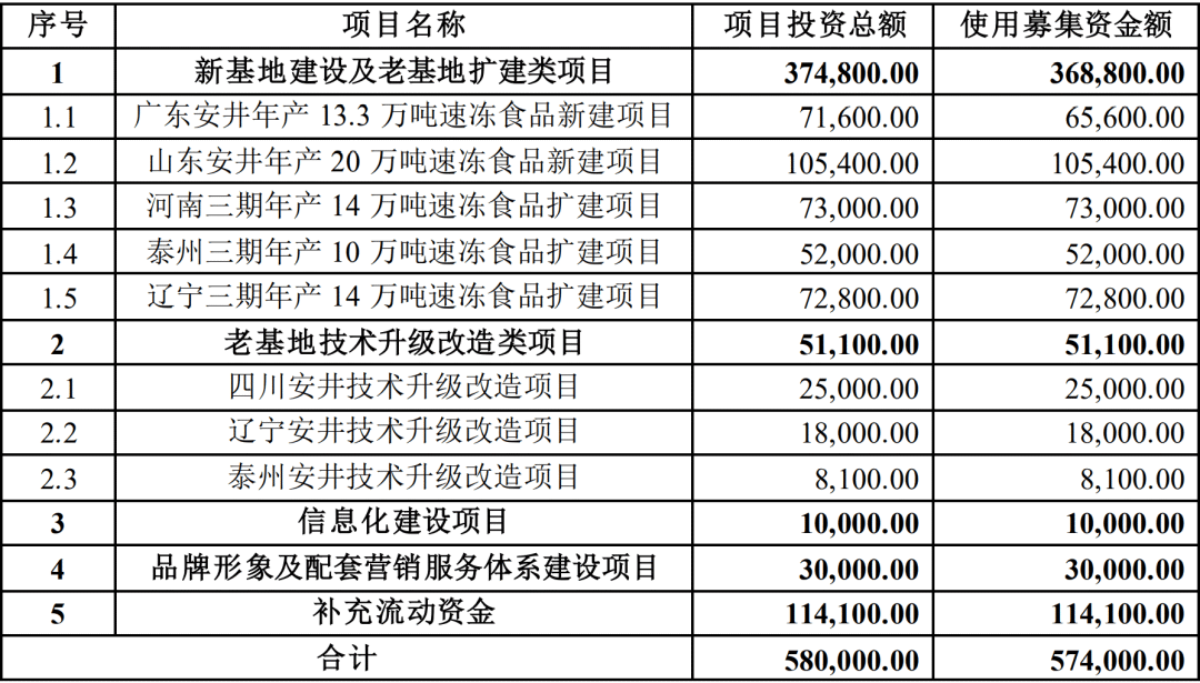 募投项目建成投产后,安井食品的新老基地将合计新增年产能71.3万吨。此次定增公司实际募资56.75亿元,与计划募资额57.4亿元差距不大。