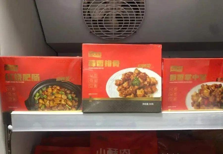 在龙大美食公司内的展示柜里,摆放着红烧肥肠、蒜香排骨等各式各样的预制菜。
